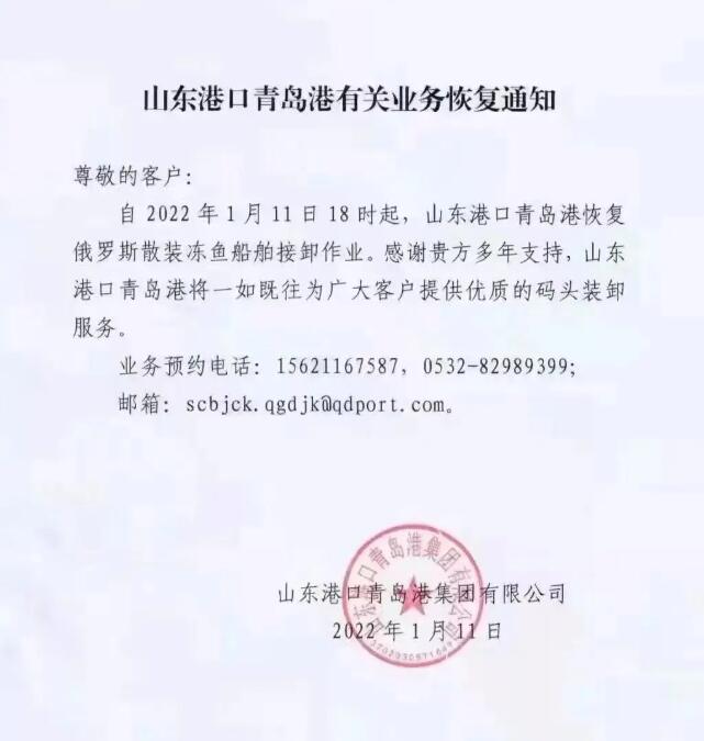 “青島港于1月11日下午6:00恢復俄羅斯凍魚船的取卸業(yè)務,”港口管理公司山東港青島港集團宣布。