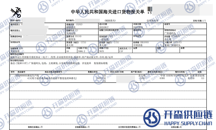 【本文結語】 上述就是意大利磨皮生產線進口報關清關代理服務【經典案例】的全部內容,希望能對您有所幫助,如有二手機械進口報關上任何疑問及問題可隨時在線聯系我們或撥打 18002611553,開森供應鏈擁有豐富的二手機械進口報關操作經驗及案例,10余年進口經驗為您所用,各類進口疑難都能為您一一解答及協助快速處理解決!