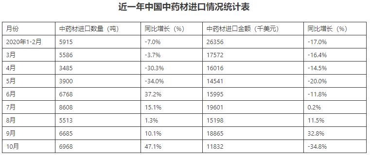 2020年1-10月中國中藥材進口數量為53428噸,增幅為3.3%;進口金額為155981千美元,降幅為10%;2020年1-10月中國中藥材進口均價為2.92千美元/噸。
