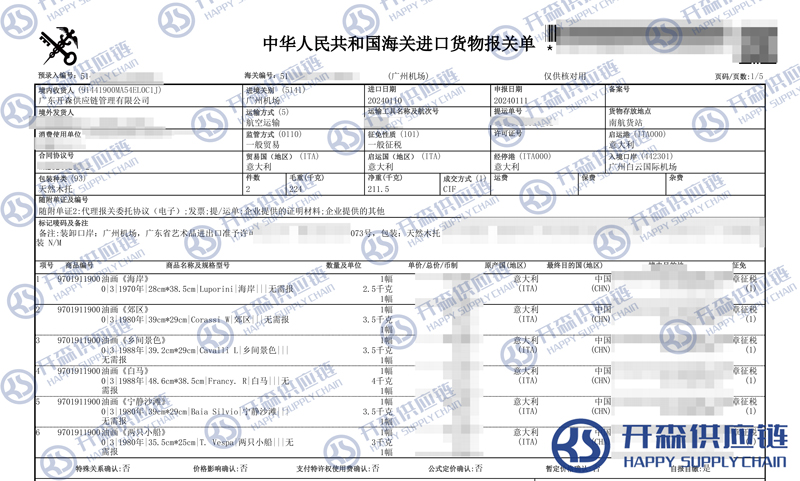 【本文結語】 上述就是廣州機場意大利油畫進口報關代理服務【清關案例】的全部內容,希望能對您有所幫助,如有油畫進口報關上任何疑問及問題可隨時在線聯系我們或撥打 18002611553,開森供應鏈擁有豐富的油畫進口報關操作經驗及案例,10余年進口經驗為您所用,各類進口疑難都能為您一一解答及協助快速處理解決!